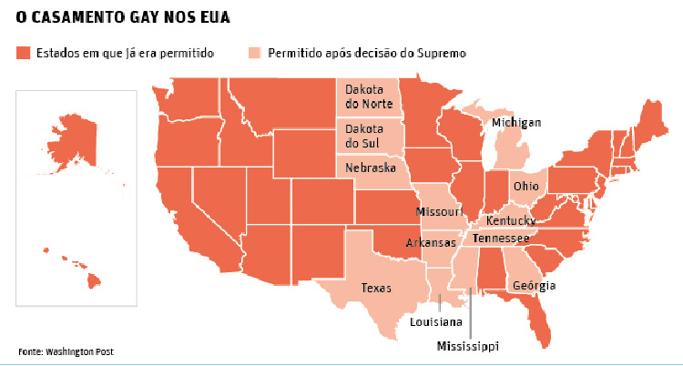 Antes da aprovação do Supremo Tribunal, o casamento gay era ilegal em vários Estados do país- tal como poderá ver no mapa que se segue. Os Estados vermelho são os Estados onde já eram legais, mas os que estavam a rosa claro são os Estados onde ainda era proibido de celebrarem a cerimónia. A partir de hoje, podemos olhar para o mapa completamente esverdeado pois desta vez foi o amor que ganhou acima de tudo!